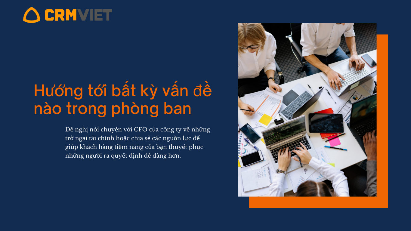 Đóng khung cuộc trò chuyện này như một sự hợp tác. Đề nghị nói chuyện với CFO của công ty về những trở ngại tài chính hoặc chia sẻ các nguồn lực để giúp khách hàng tiềm năng của bạn thuyết phục những người ra quyết định dễ dàng hơn.