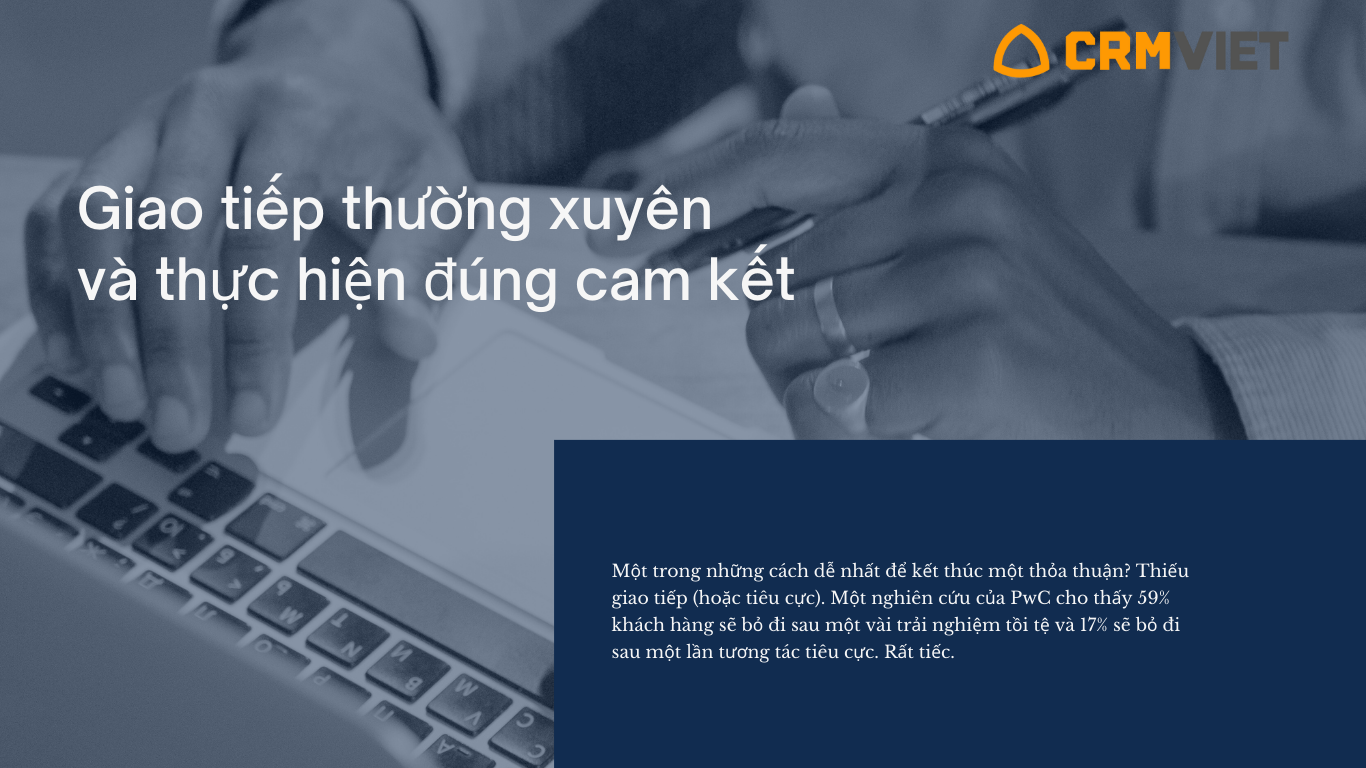 Một trong những cách dễ nhất để kết thúc một thỏa thuận? Thiếu giao tiếp (hoặc tiêu cực). Một nghiên cứu của PwC cho thấy 59% khách hàng sẽ bỏ đi sau một vài trải nghiệm tồi tệ và 17% sẽ bỏ đi sau một lần tương tác tiêu cực.