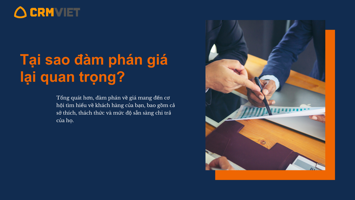 Việc đàm phán về giá có thể rất căng thẳng, ngay cả đối với những chuyên gia bán hàng giàu kinh nghiệm. Một sai lầm có thể tác động tiêu cực đến tình hình tài chính của thương vụ — và doanh nghiệp của bạn. Tuy nhiên, các cuộc đàm phán có thể phải mất một chặng đường dài để hướng tới việc nuôi dưỡng mối quan hệ khách hàng lâu dài, có thể bao gồm các cơ hội bán hàng bổ sung. Điều đó có nghĩa là doanh thu nhiều hơn và hoa hồng cao hơn.