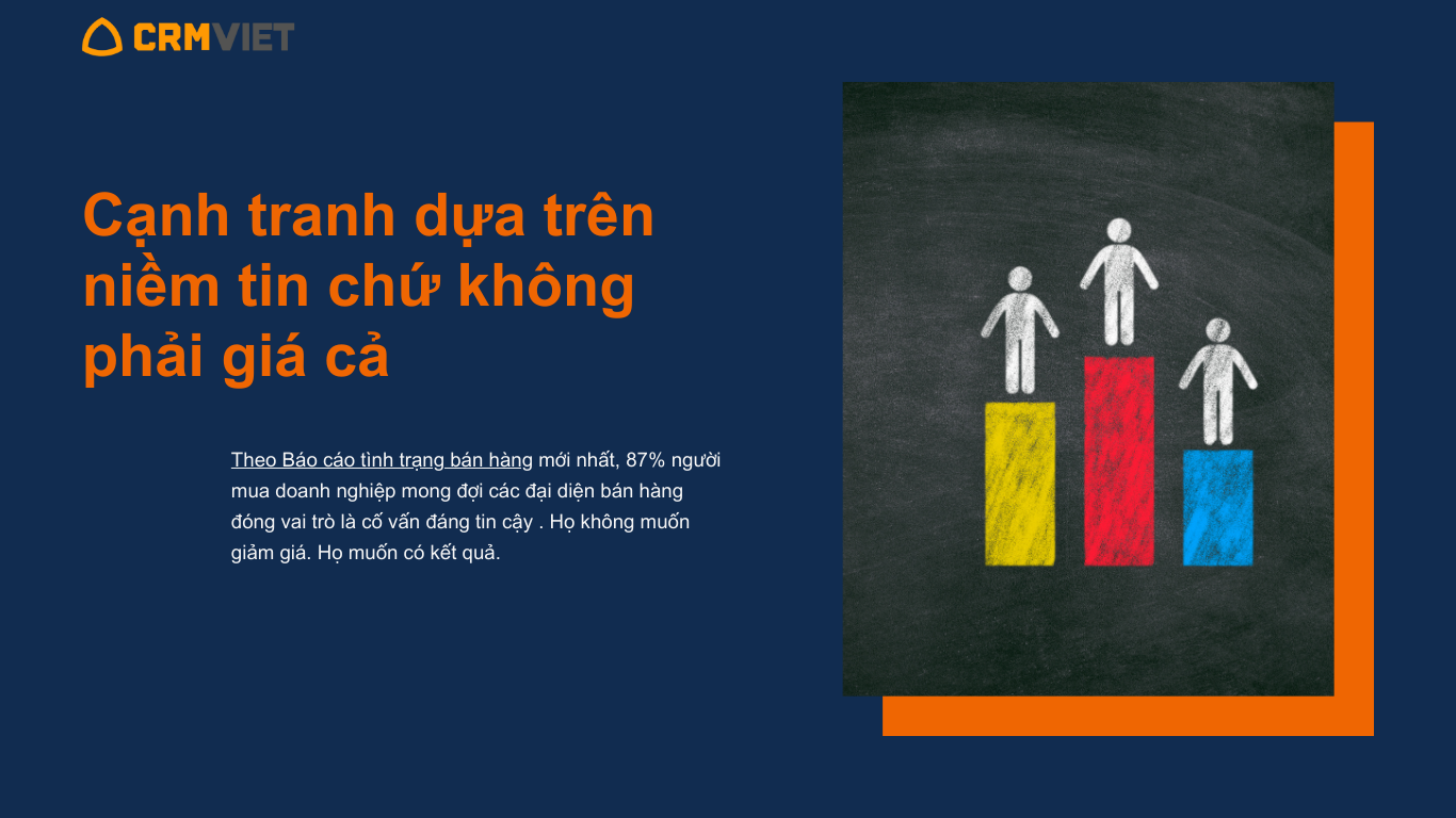 Bạn có thể nghĩ rằng trong thời kỳ kinh tế suy thoái, điều quan trọng nhất là giá cả. Thực chất đó là sự tin tưởng. Theo Báo cáo tình trạng bán hàng mới nhất của Salesforce, 87% người mua doanh nghiệp mong đợi các đại diện bán hàng đóng vai trò là cố vấn đáng tin cậy . Họ không muốn giảm giá. Họ muốn có kết quả.