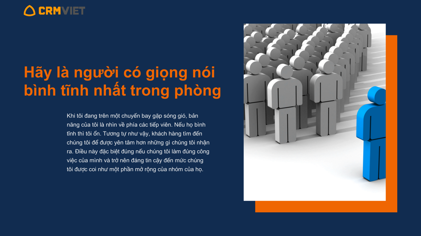 Khi tôi đang trên một chuyến bay gặp sóng gió, bản năng của tôi là nhìn về phía các tiếp viên. Nếu họ bình tĩnh thì tôi ổn. Tương tự như vậy, khách hàng tìm đến chúng tôi để được yên tâm hơn những gì chúng tôi nhận ra. Điều này đặc biệt đúng nếu chúng tôi làm đúng công việc của mình và trở nên đáng tin cậy đến mức chúng tôi được coi như một phần mở rộng của nhóm của họ.