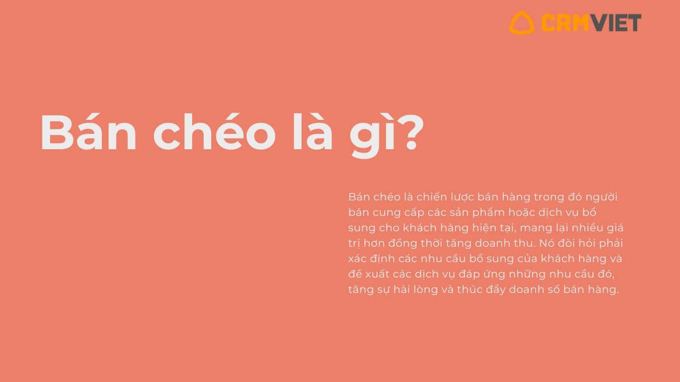 Bán chéo là chiến lược bán hàng trong đó người bán cung cấp các sản phẩm hoặc dịch vụ bổ sung cho khách hàng hiện tại, mang lại nhiều giá trị hơn đồng thời tăng doanh thu. Nó đòi hỏi phải xác định các nhu cầu bổ sung của khách hàng và đề xuất các dịch vụ đáp ứng những nhu cầu đó, tăng sự hài lòng và thúc đẩy doanh số bán hàng.