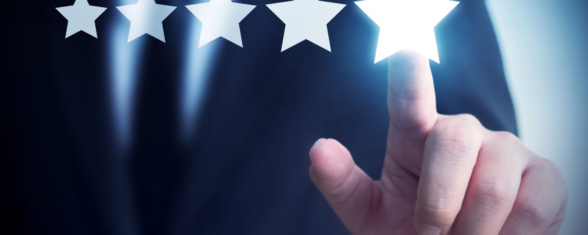 Businessman hand touching five star symbol to increase rating of company concept, Copy space background for your title
