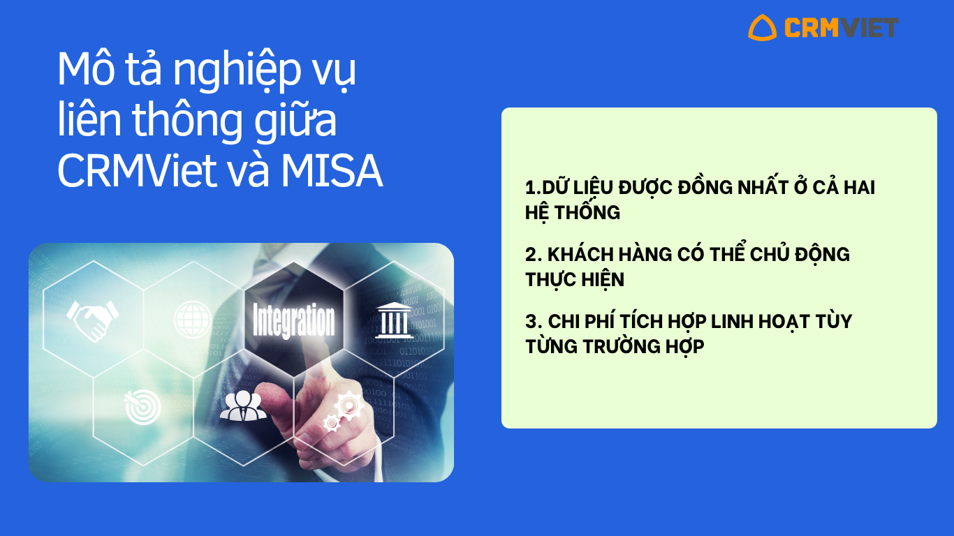 Việc tích hợp CRMViet với phần mềm kế toán MISA giúp doanh nghiệp đồng bộ dữ liệu hai chiều, loại bỏ hoàn toàn tình trạng nhập liệu thủ công và sai lệch số liệu giữa các phòng ban.