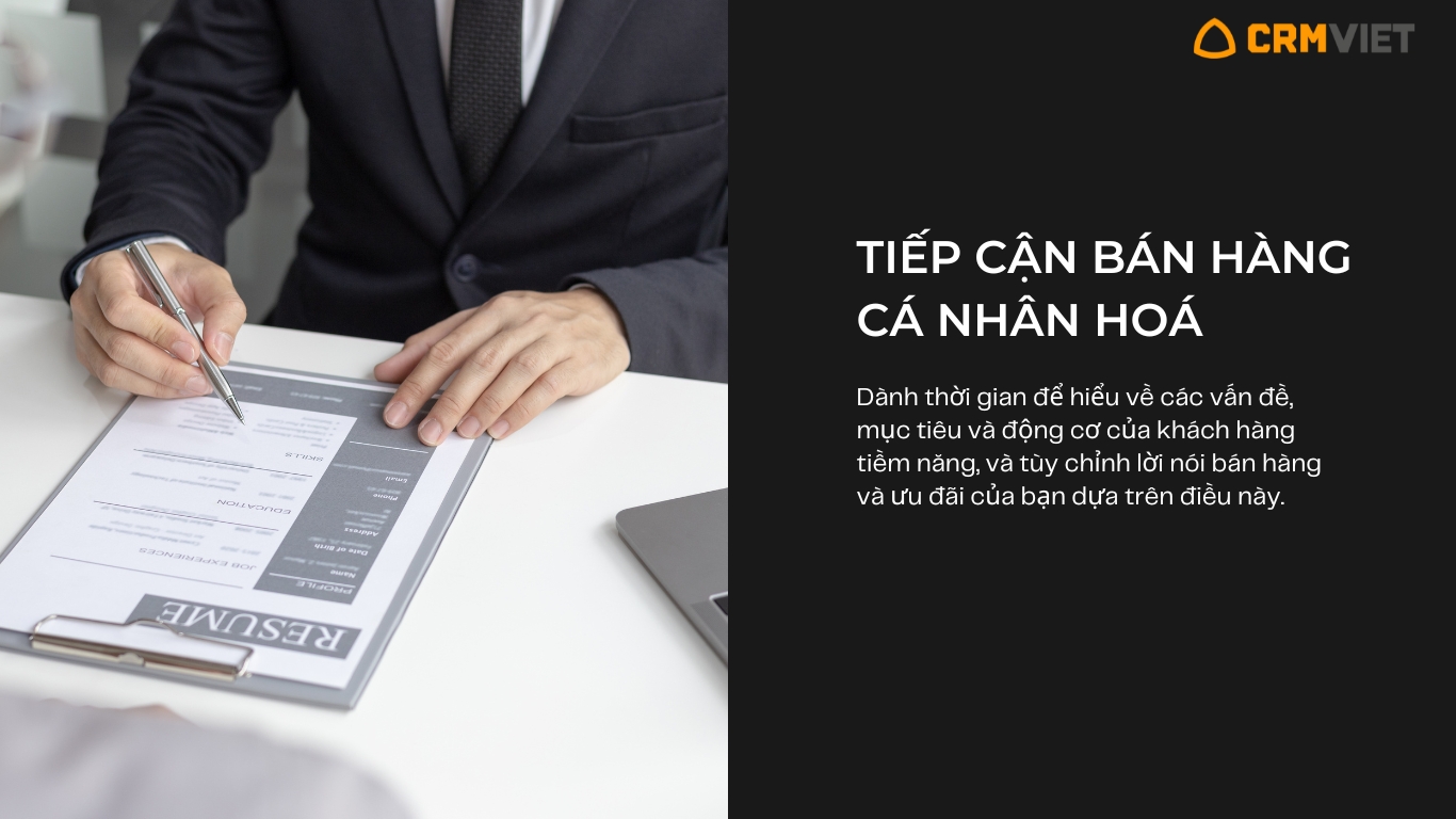 Tùy chỉnh phương pháp bán hàng để đáp ứng nhu cầu và sở thích đặc biệt của từng khách hàng tiềm năng. Dành thời gian để hiểu về các vấn đề, mục tiêu và động cơ của khách hàng tiềm năng, và tùy chỉnh lời nói bán hàng và ưu đãi của bạn dựa trên điều này. Sự cá nhân hóa giúp xây dựng lòng tin và tăng khả năng chuyển đổi khách hàng tiềm năng thành khách hàng.