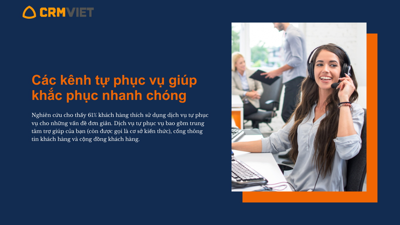 Nghiên cứu cho thấy 61% khách hàng thích sử dụng dịch vụ tự phục vụ cho những vấn đề đơn giản. Dịch vụ tự phục vụ bao gồm trung tâm trợ giúp của bạn (còn được gọi là cơ sở kiến thức), cổng thông tin khách hàng và cộng đồng khách hàng. Khách hàng truy cập trung tâm trợ giúp của bạn để tìm câu trả lời cho các câu hỏi phổ biến. Với các cổng thông tin, họ đăng nhập để truy cập thông tin của mình, chẳng hạn như các giao dịch mua trước đây và bắt đầu các quy trình từng bước dễ dàng, chẳng hạn như yêu cầu trả lại hàng. Họ có thể nhận và chia sẻ các mẹo về sản phẩm trong cộng đồng khách hàng của bạn.