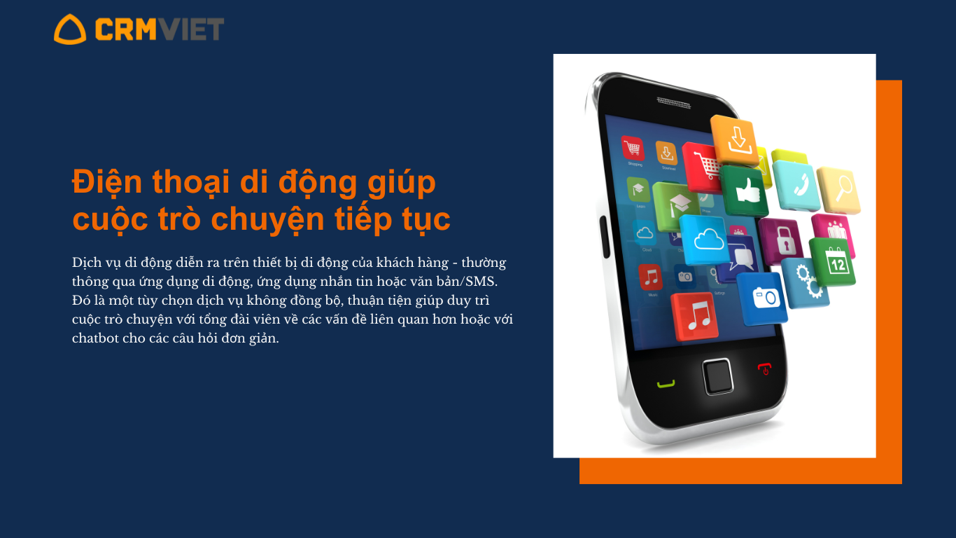Dịch vụ di động diễn ra trên thiết bị di động của khách hàng – thường thông qua ứng dụng di động, ứng dụng nhắn tin hoặc văn bản/SMS. Đó là một tùy chọn dịch vụ không đồng bộ, thuận tiện giúp duy trì cuộc trò chuyện với tổng đài viên về các vấn đề liên quan hơn hoặc với chatbot cho các câu hỏi đơn giản. Điện thoại di động cũng cung cấp hồ sơ về các tương tác trong quá khứ.