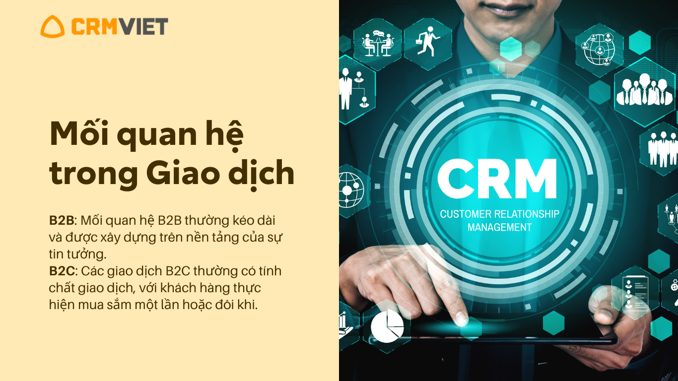 B2C: Các giao dịch B2C thường có tính chất giao dịch, với khách hàng thực hiện mua sắm một lần hoặc đôi khi. Mặc dù xây dựng sự trung thành quan trọng, nhưng thường tập trung vào giao dịch cụ thể.
