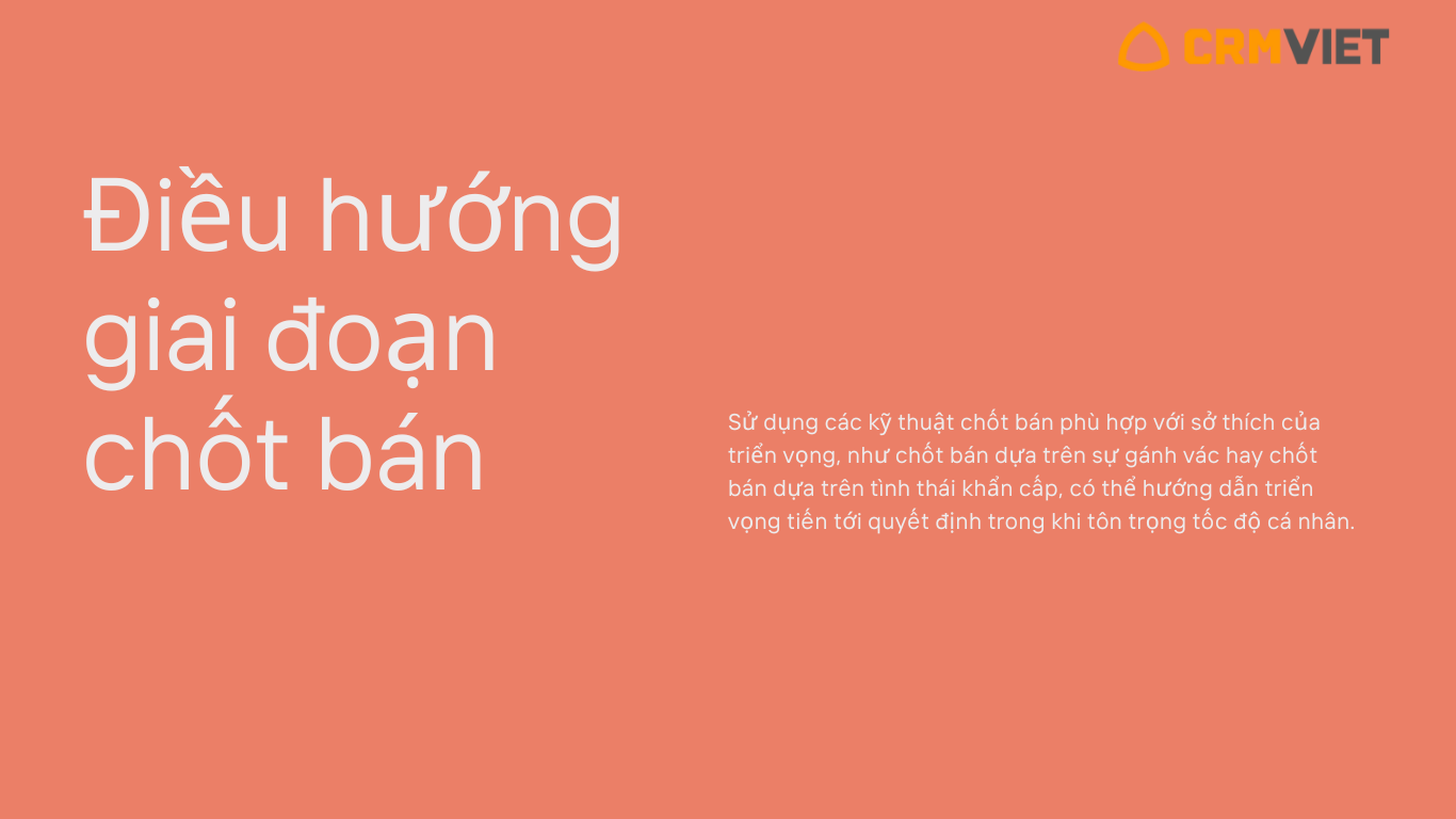 Sử dụng các kỹ thuật chốt bán phù hợp với sở thích của triển vọng, như chốt bán dựa trên sự gánh vác hay chốt bán dựa trên tình thái khẩn cấp, có thể hướng dẫn triển vọng tiến tới quyết định trong khi tôn trọng tốc độ cá nhân. Điều hướng giai đoạn chốt bán yêu cầu sự tinh tế, chiến lược và một phương pháp tập trung vào khách hàng.